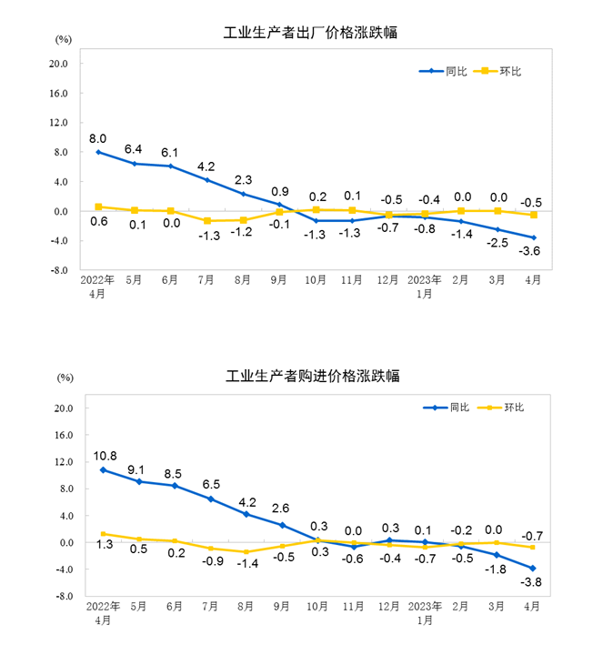 ในราคาซื้อของผู้ผลิตภาคอุตสาหกรรม ราคาวัตถุดิบ เคมีภัณฑ์ ลดลงร้อยละ 9.2 ราคาวัสดุโลหะเหล็ก ลดลงร้อยละ 9.0 ราคาเชื้อเพลิงและพลังงาน ลดลงร้อยละ 5.3 ราคาวัสดุโลหะที่ไม่ใช่เหล็กและ สายไฟลดลงร้อยละ 4.5 และราคาวัสดุก่อสร้างและวัสดุอโลหะลดลงร้อยละ 9.0 ราคาลดลงร้อยละ 4.4 ราคาสินค้าเกษตรและสินค้าปลีกเพิ่มขึ้นร้อยละ 1.2 เมื่อเทียบรายเดือนดัชนีราคาผู้ผลิต(PPI) ลดลงร้อยละ 0.5 เมื่อเทียบรายเดือนในเดือนเมษายน ซึ่งได้รับผลกระทบหลักจากราคาของอุตสาหกรรมเหมืองแร่และวัตถุดิบ โดยเฉพาะราคาปัจจัยการผลิตลดลงร้อยละ 0.6 ซึ่งส่งผลต่อระดับราคาผู้ผลิตภาคอุตสาหกรรมโดยรวมลดลงประมาณ 0.44 จุดเปอร์เซ็นต์ ในหมู่พวกเขา ราคาของอุตสาหกรรมเหมืองแร่ลดลงร้อยละ 2.0 ราคาของอุตสาหกรรมวัตถุดิบลดลงร้อยละ 0.8 และราคาของอุตสาหกรรมแปรรูปลดลงร้อยละ 0.4 ราคาของปัจจัยยังชีพลดลงร้อยละ 0.3 ซึ่งส่งผลต่อระดับราคาโรงงานของผู้ผลิตภาคอุตสาหกรรมโดยรวมลดลงประมาณ 0.07 จุดเปอร์เซ็นต์ ในหมู่พวกเขาราคาอาหารลดลงร้อยละ 0.5 ราคาเสื้อผ้าและของใช้ในชีวิตประจำวันทั่วไปทรงตัว และราคาสินค้าคงทนอุปโภคบริโภคลดลงร้อยละ 0.3 ในราคาซื้อของผู้ผลิตภาคอุตสาหกรรม ได้แก่ ราคาเชื้อเพลิงและพลังงานลดลงร้อยละ 2.0 ราคาวัตถุดิบเคมีภัณฑ์และสินค้าเกษตรและปลีกย่อยลดลงร้อยละ 1.1 และราคาวัสดุโลหะเหล็กลดลงร้อยละ 0.4 ราคาของ วัสดุโลหะและสายไฟเพิ่มขึ้นร้อยละ 0.2