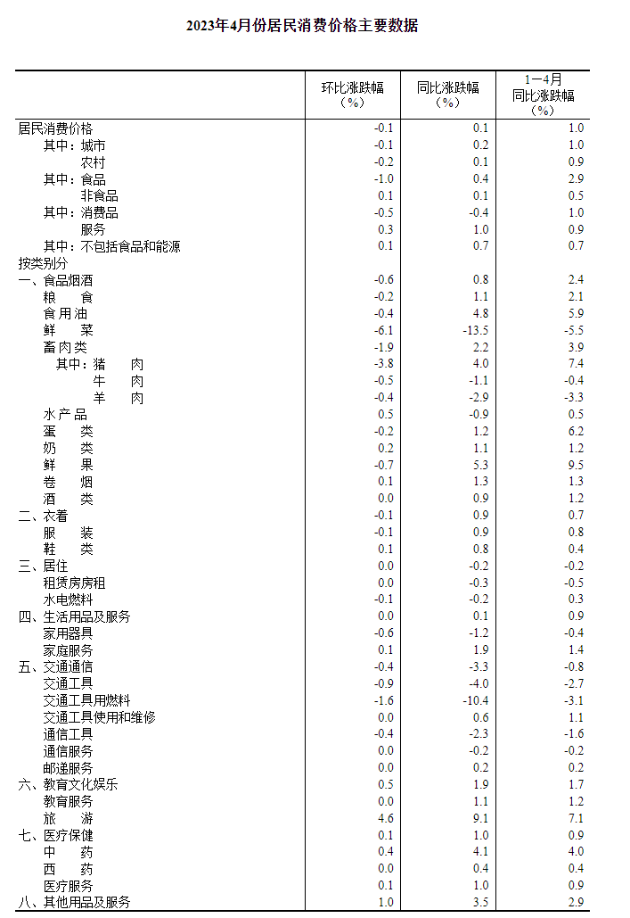 ซึ่งส่งผลต่อดัชนีราคาผู้บริโภคประมาณ 0.06 จุดเปอร์เซ็นต์ ซึ่งราคาเนื้อหมูลดลงร้อยละ 3.8 ซึ่งส่งผลต่อ ดัชนีราคาผู้บริโภค(CPI) ประมาณ 0.05 จุดเปอร์เซ็นต์ ราคาผลไม้สด การลดลง 0.7จุดเปอร์เซ็นต์ ส่งผลต่อ ดัชนีราคาผู้บริโภค(CPI) ประมาณ 0.02 เปอร์เซ็นต์ ราคาสินค้าสัตว์น้ำเพิ่มขึ้น 0.5 เปอร์เซ็นต์ และส่งผลต่อดัชนีราคาผู้บริโภค(CPI) ประมาณ 0.01 จุดเปอร์เซ็นต์ ราคาของสินค้าอีก 7 ประเภทเพิ่มขึ้น 3 เท่า ทรงตัว และลดลง 2 เดือนต่อเดือน ในหมู่พวกเขา ราคาสินค้าและบริการอื่นๆ การศึกษา วัฒนธรรมและความบันเทิง และการรักษาพยาบาลเพิ่มขึ้น ร้อยละ1.0 ร้อยละ0.5 และร้อยละ 0.1 ตามลำดับ ราคาที่อยู่อาศัย สิ่งจำเป็นในชีวิตประจำวัน และบริการล้วนทรงตัว ราคาของ การขนส่งและการสื่อสาร และเสื้อผ้าลดลงร้อยละ 0.4 และร้อยละ 0.1 ตามลำดับ